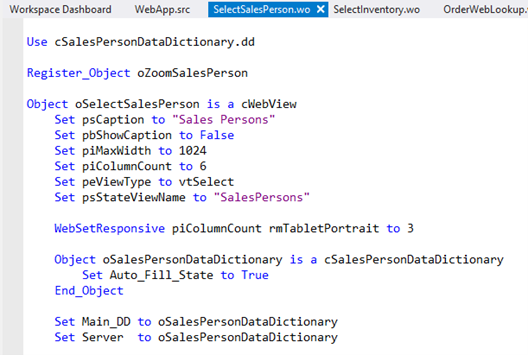 This is the WebOrderMobile example application. Here you can see that within the webview object, there is an Object called oSalesPersonDataDictionary. This is a DDO, a Data Dictionary Object. In this case it is an implementation of the cSalesPersonDataDictionary class. In this DDO, a property Auto_Fill_State of that Data Dictionary is set, to deviate from the standard Sales Person Data Dictionary. Also, the Main_DD of the webview object is set to this Data Dictionary. The use of Main_DD is to identify the DataDictionary Object that controls the database table whose data is central to this object's function, the web view in this case. Main_DD must be one of the DDOs contained within this object. So, oSalesPersonDataDictionary in this case.
