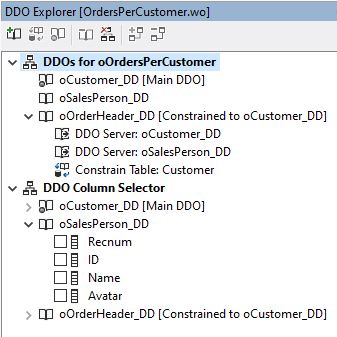 Here is an example where there are three DDOs, for the Customer, Sales Person, and Order Header tables. Different elements of the column selector are represented by different icons in the tree. Here is a list of the icons and their meaning: