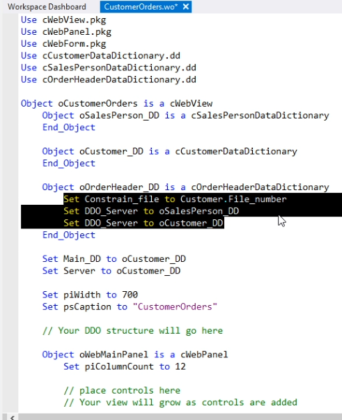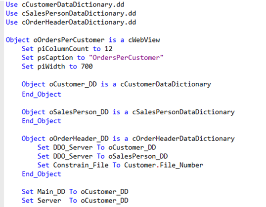 In most cases the Main_DD and Server are set to the same Data Dictionary. But views can be much more complex. They can have data-aware grouping containers, such as dbGroup, dbContainer3D or dbTabDialog, inside the view, each of which have child DEOs. While there can be only one Main_DD set in the component, typically, a Set Server statement could be programmed at each of these container levels, but that is only needed when the container uses a different DDO. The Studio will actually help you with this when creating views via the wizard or when dragging table columns from the DDO Explorer, as we will see in a minute. Set Server is of importance for instructing where request_save and request_delete are handled.
