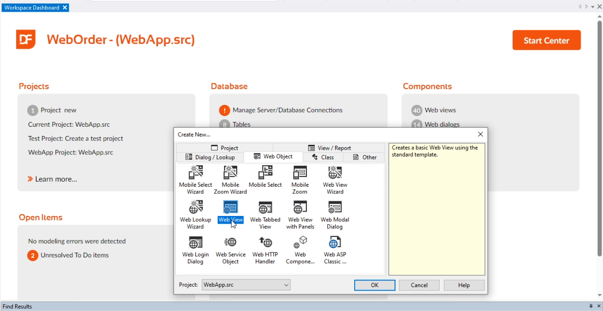 Open the DataFlex Studio with the WebOrder project. I do Create new, Web Object, and select Web View, to create a new Web View in which I want the user to select a customer and then view all its Orders.