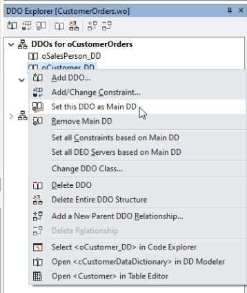 It will now not only create a DDO for OrderHeader, but it will create the complete DDO structure of OrderHeader with its parents, which are SalesPerson and Customer. As you can see, it made OrderHeader the Main_DD, but I want the Customer to be the focal point for this web view. So I right-click the Customer_DD and say ”set this DDO as main DD”.