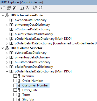 Now let’s look at an example of using a parent table in a view. Here is a DDO structure with OrderHeader being the main DDO and the Customer table is a parent table. Now, what would happen if I would select a foreign key column in the DDO Explorer and drag it onto a view where an Order Header record can be maintained.