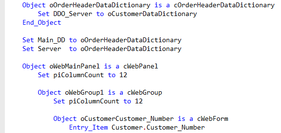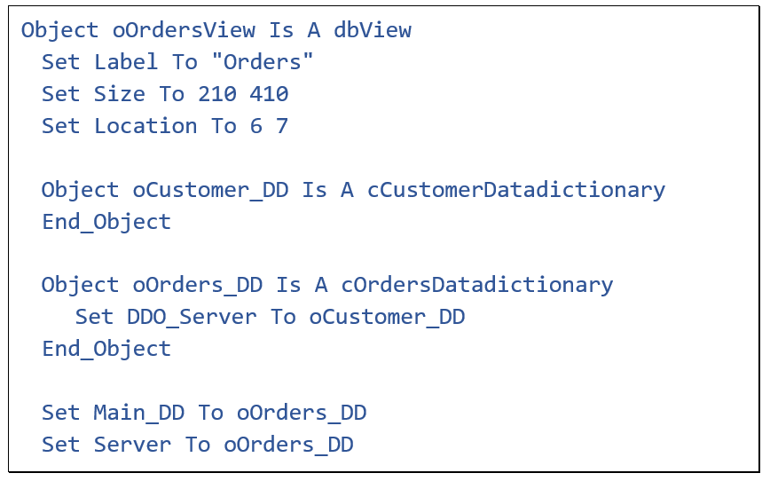 As mentioned in lesson 2, in the view component, or dialog or report, for each table that is needed, a Data Dictionary Object must be defined, and they must be connected correctly. This is done using the DDO_Server property. As shown in this example, DDO_Server must be set in the child, to connect it to the parent. With multiple tables, this can be complex, and the Studio wizards or the DDO Explorer can generate this structure for you.