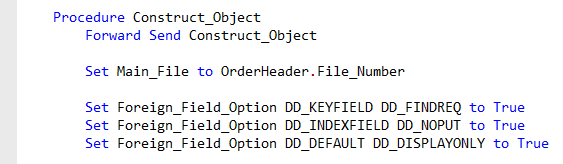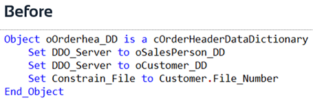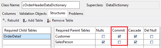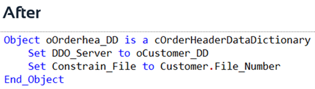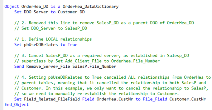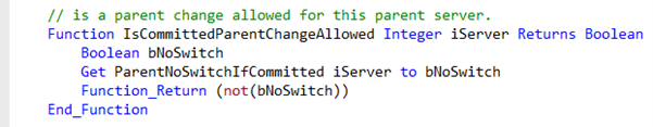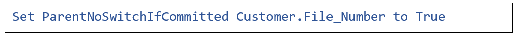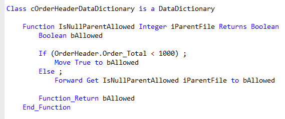 There may be cases where you want a more dynamic approach. For example, a change of the customer could be allowed as long as the order is not finished or in production. This could be done by overriding the IsCommittedParentChangeAllowed function. This function is part of the Data Dictionary base class, which you can find in DataDict.pkg in the packages folder.