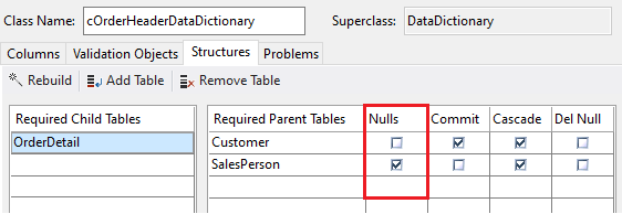 For this, the "Nulls" checkbox next to the parent table needs to be selected. It generates a line of code like this in the OrderHeader Data Dictionary class. This makes the presence of a sales person parent record optional.