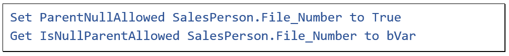 Sometimes it is desired that the relationship to the parent table is optional. This means that it is allowed that a foreign key field in a child table record has the value Null. By default this is not allowed. For example, when during the registration of an order you might not know the salesperson and want to fill this in later. Then it can be left empty at first.