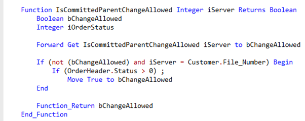 Note the Forward Get statement to the original IsCommittedParentChangeAllowed function. What will happen now is that if the ParentNoSwitchIfCommitted checkbox is checked, it will also look at the order status. And if that status allows a change, the function will return True after all, even though the checkbox is checked. And this means that a change in a foreign key column is allowed in the table.