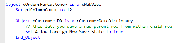 If you would want to ignore these foreign table options in a particular DDO, which could be useful in a data entry view, then set the Allow_Foreign_New_Save_State property in the DDO to True, as shown in this example. Do not set this property in the DD class.