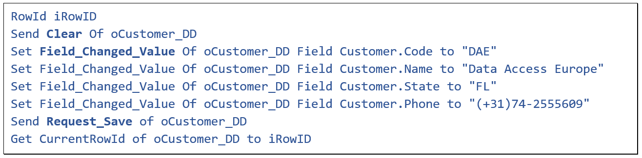After a clear, four columns of data are set and then Request_Save is done, which under the hood takes care of the saving logic. After a successful save, the global buffer will be the same as the local DDO buffer, except for the RowId, which was empty before saving the new row and it got a value upon the save.