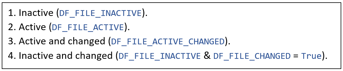 First, inactive. The state of a row buffer can be made inactive using the Clear data dictionary message. This clears the local and global buffer. Second, it is active after a successful Data Dictionary Find. And the state of the row buffer is changed when a value has been moved to either an active or inactive local DDO buffer.