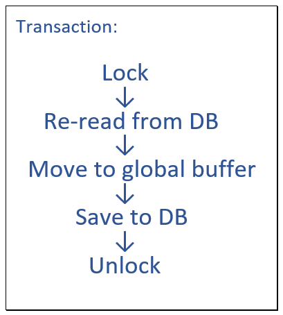 Finally, the transaction will be ended resulting in a commit of the row changes. And the unlock command is executed to release the lock. Any errors that occur during the transaction abort the process and roll back any already made changes. The global buffer will be restored to what it was before the transaction.