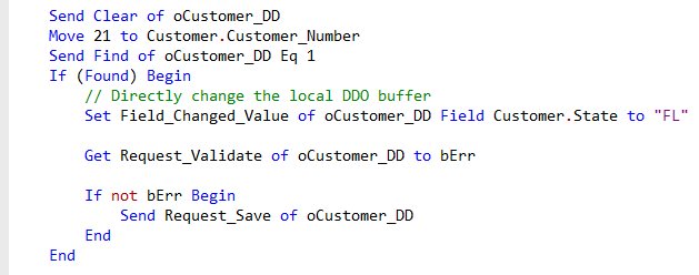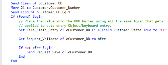 If you are performing saves manually within a Batch Process or a Web Object, you will need to send Request_Validate yourself. In other cases, for example when using a Web Browser object's high level save, such as in a mobile zoom webview, this message is sent for you. If the validation of any field fails, it returns a non-zero value. An error message will usually be generated when a field validation fails. And the save will not proceed: In this code, the Request_Save is not done. And if there are Data Entry Objects attached to the DDO, it will attempt to give the focus to the DEO that contains the invalid field data.
