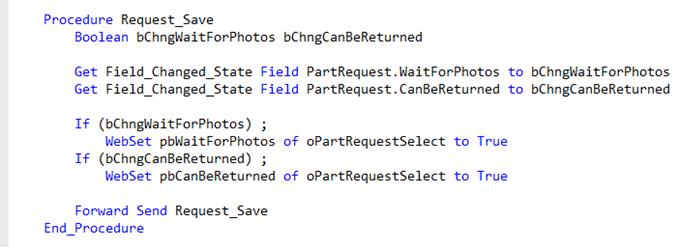 In this example the Request_Save procedure is augmented to first inspect whether two columns have been changed before doing the save. Depending on their Field_Changed_State, it does something additional.