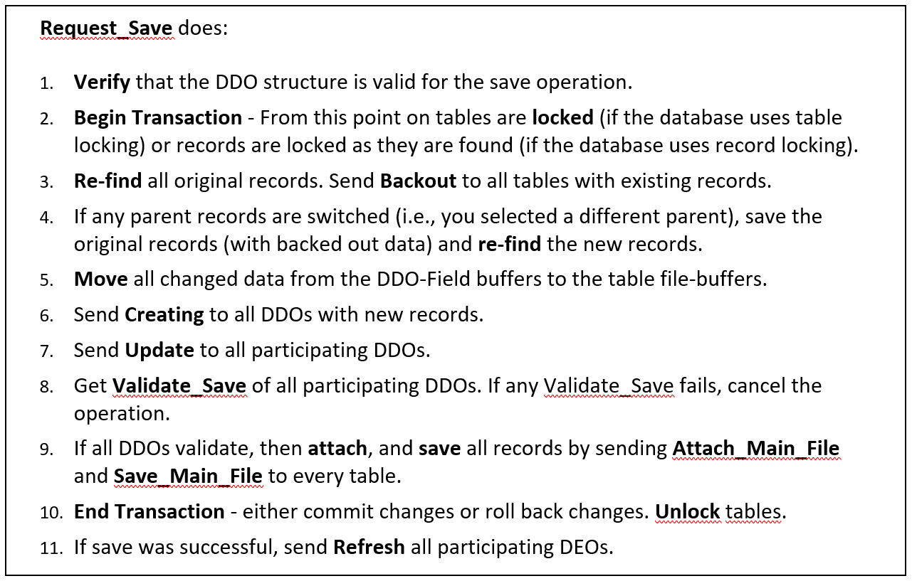 First it verifies that the DDO structure is valid for the save operation. If so, the transaction is started and tables are locked, as I already mentioned. It does a re-find of the original records to merge in last-minute changes that might have been done. In step 5 it actually moves the changed data into the global file buffers, after which it sends Creating and Update messages.