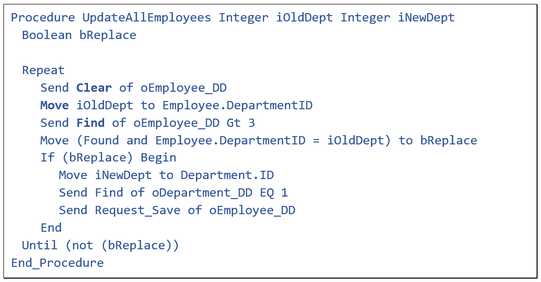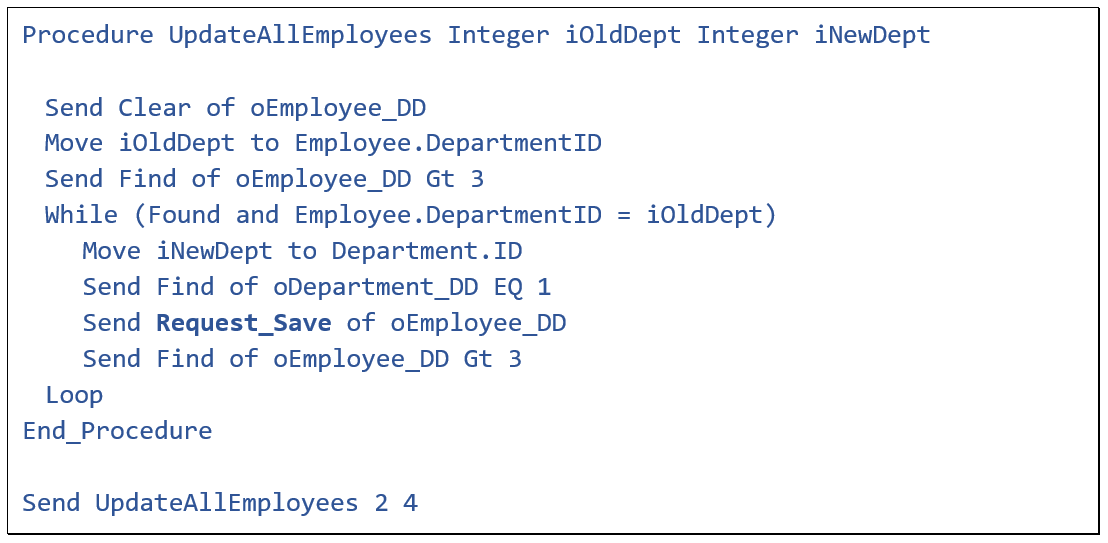 Let’s have a look. Before the loop, it seeds the Employee table with the old department, number 2, to find an employee record. If it is found and it is that department, then it updates the record to the new department, number 4, using Request_Save.