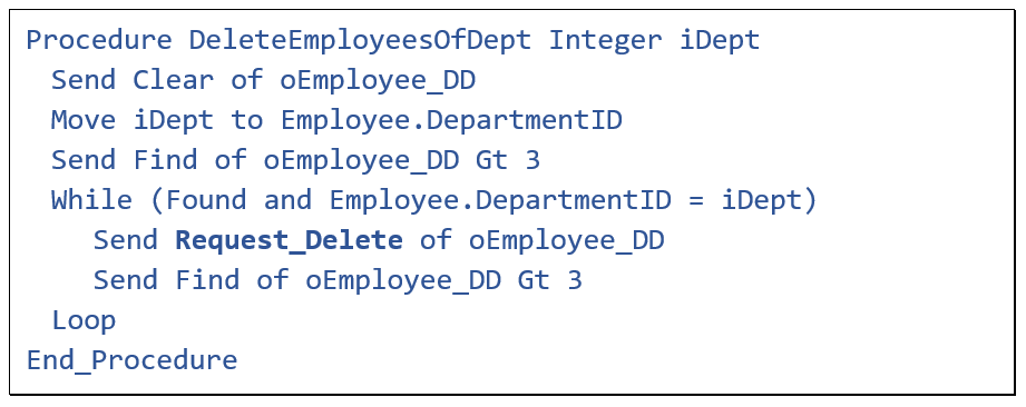 This example shows the deletion of all employees of a particular department. At a lower level it executes the Delete command.