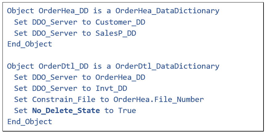 In this example, when a Request_Delete is sent to OrderHeader, the order header row gets deleted but the order detail lines are not deleted. And if the Request_Delete is sent to the OrderDetail_DD, nothing gets deleted. You should use the property with care as it is possible to create database inconsistency.